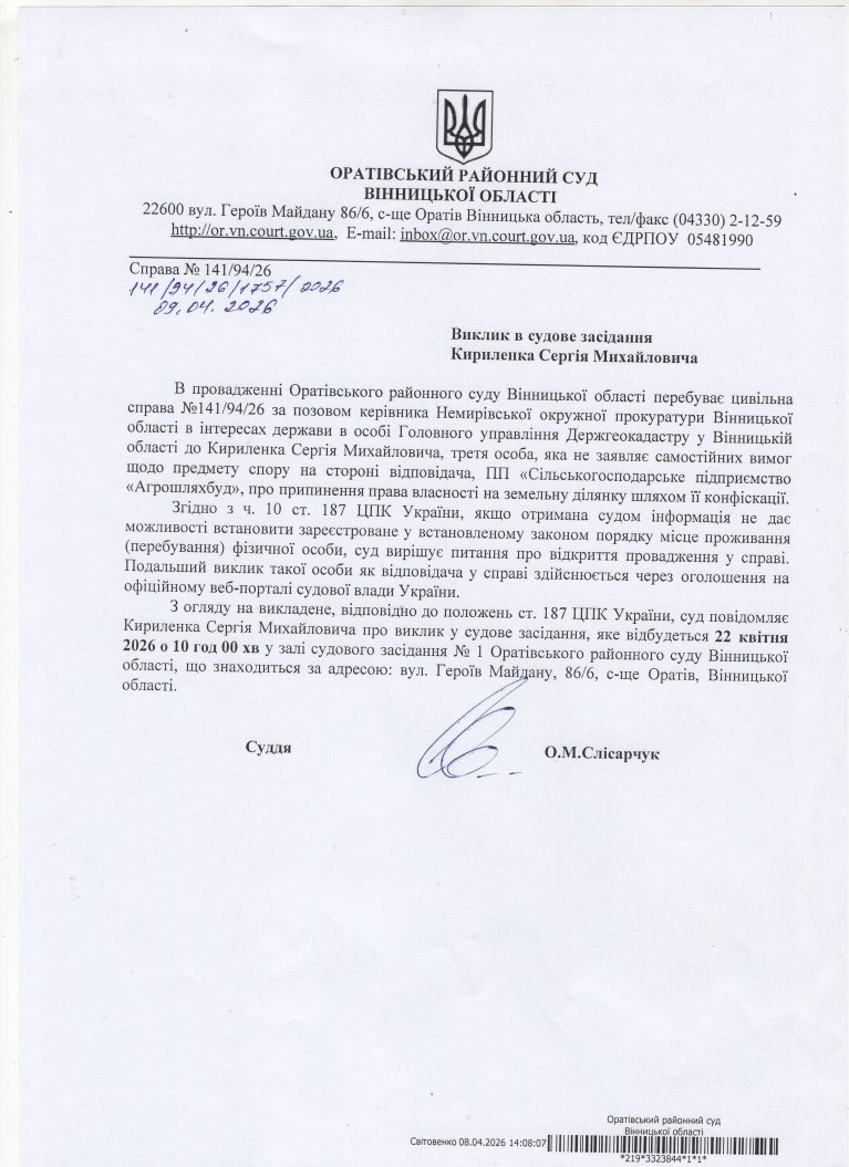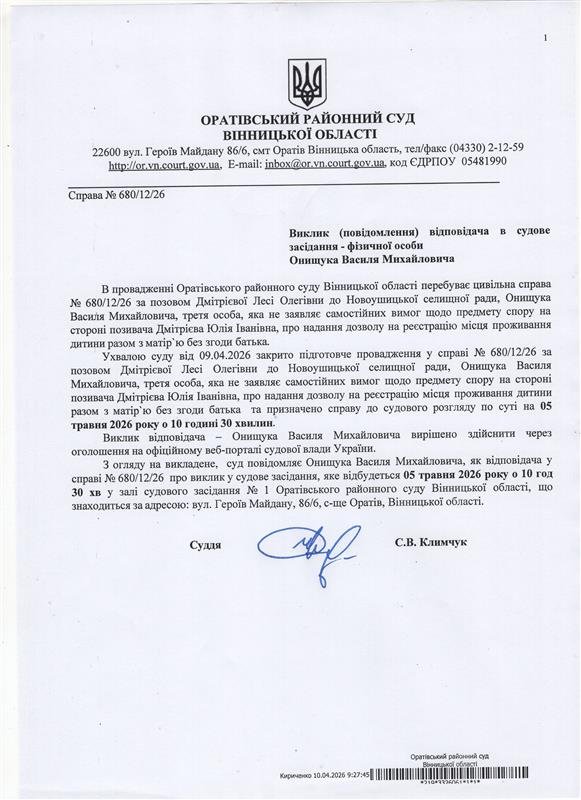 Заява Дзензелівської Людмили Миколаївни до Оратівської селищної ради про вствновлення факту, що має юридичне значення