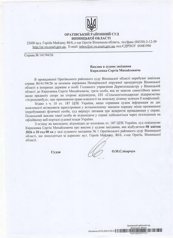 Оголошення про виклик до суду Кириленка Сергія Михайловича