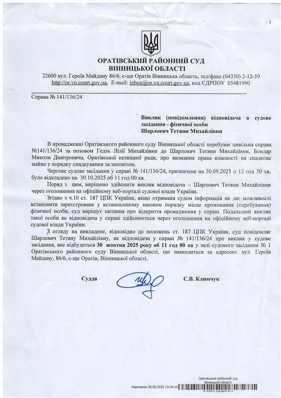 Оголошення про виклик до суду Шарлович Тетяни Михайлівни