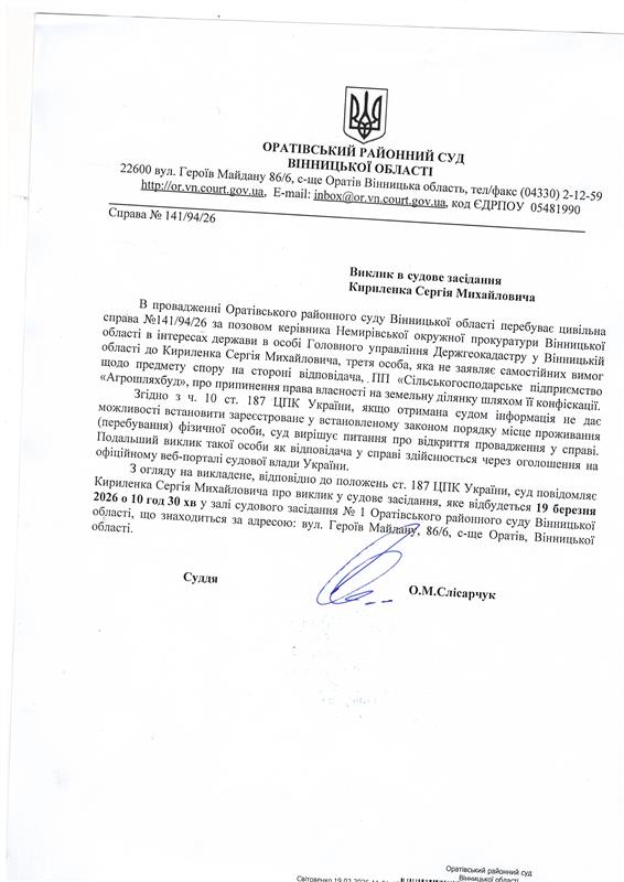 Оголошення про виклик до суду Кириленка Сергія Михайловича
